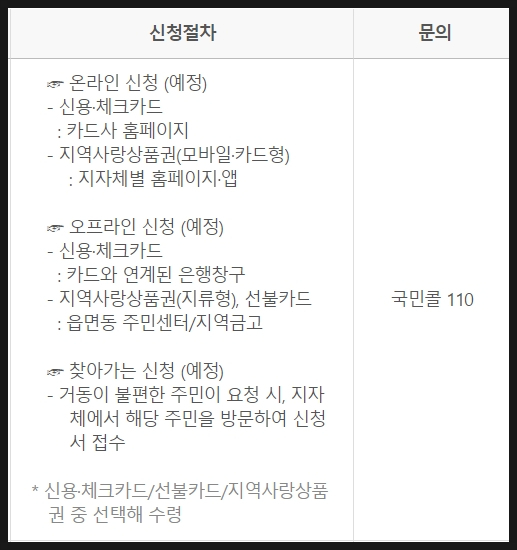 신용, 체크카드사 홈페이지에서 온라인 신청을 하거나, 지자체별 지역사랑상품권 홈페이지 어플에서도 가능하다고 합니다.