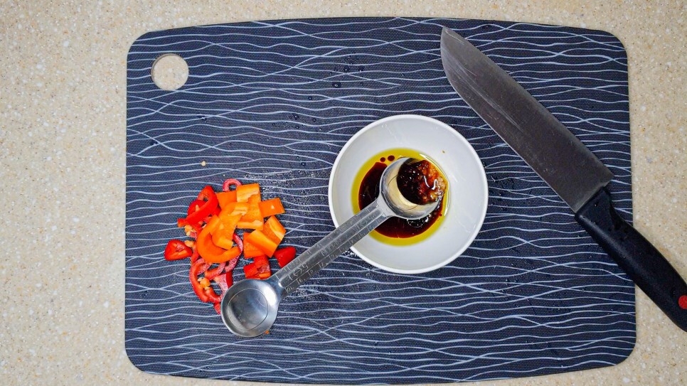 저는 파프리카를 너무 작게 썰었어요. 고구마랑 비슷한 크기로 썰어주는 게 더 좋을 거 같아요.