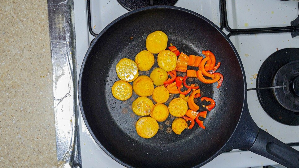 넓은 팬을 중간 불로 달구고 식용유를 살짝 두른 다음 썰어둔 고구마랑 파프리카를 동시에 넣고 앞뒤로 잘 구워주세요.