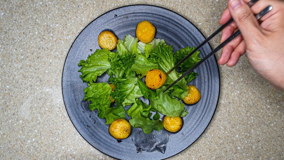 샐러드 야채를 미리 올려둔 그릇 있죠? 거기에 고구마랑 파프리카를 예쁘게 올릴 겁니다.