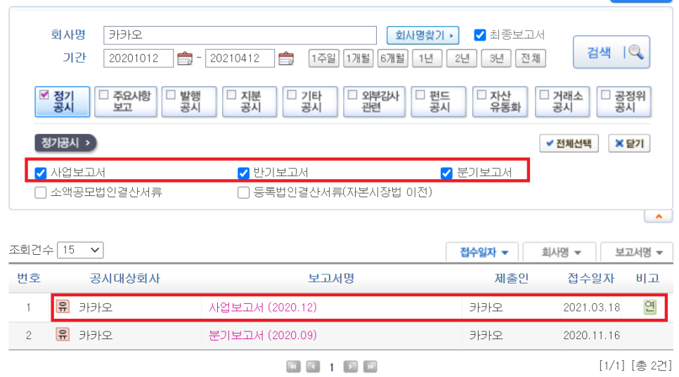 검색버튼을 누르기 전에, [정기공시]를 체크합니다.